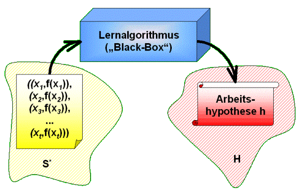 Ein Lernalgorithmus ist also eine Art „Black-Box“, in die eine beliebig lange (aber nicht unendlich lange) Folge von Beispielen zusammen mit ihren Kategorisierungen geworfen wird, und die eine Arbeitshypothese auswirft. Ein deterministischer Lernalgorithmus darf demzufolge auch als eine Abbildung von der Menge aller kategorisierten Beispielfolgen auf die Menge aller Hypothesen betrachtet werden: